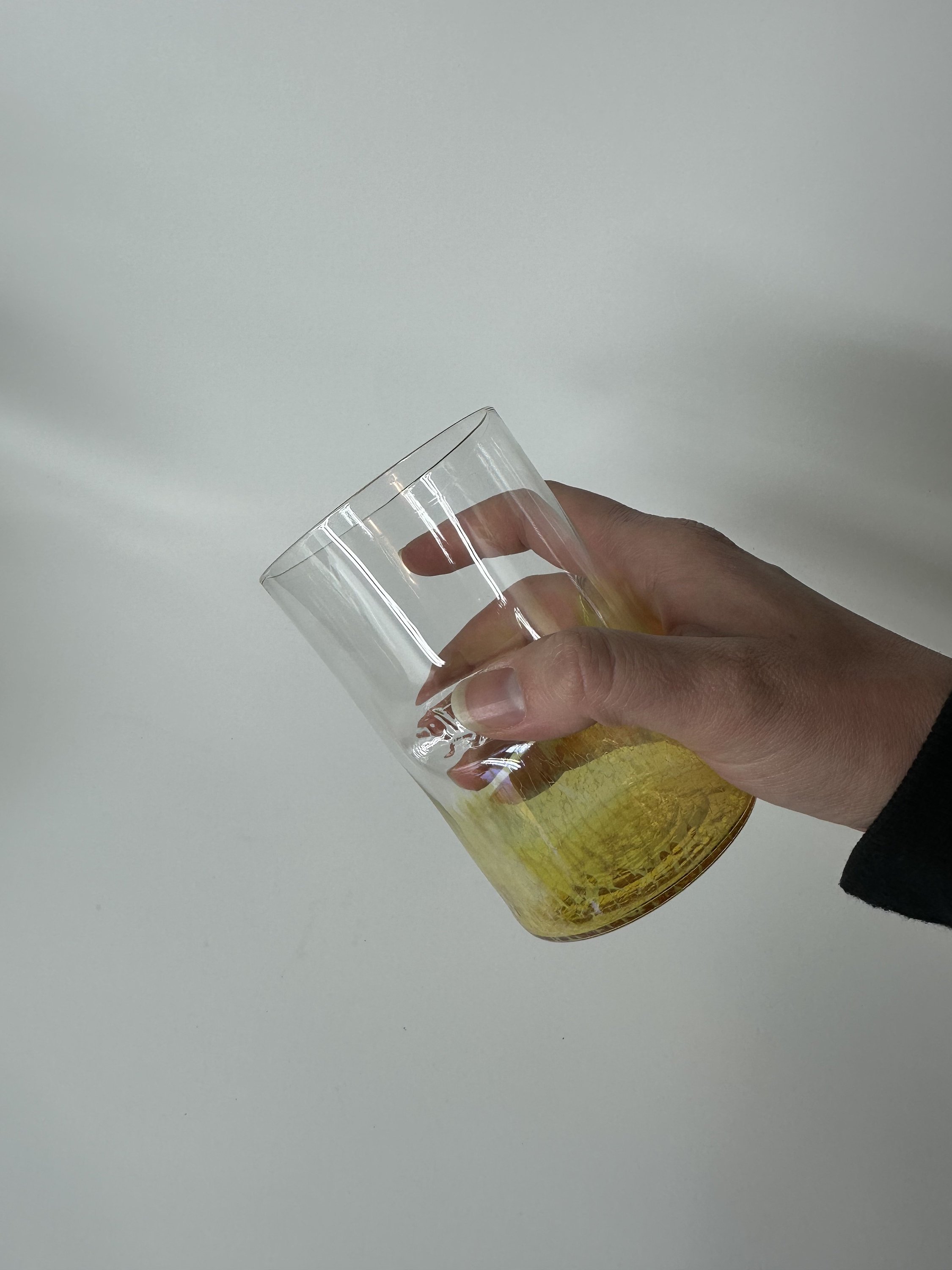 This is a handblown glass with a thumbprint in the side. There is gold metallic color on the bottom and each one is a little different! It holds approximately 12 ounces and is dishwasher safe.